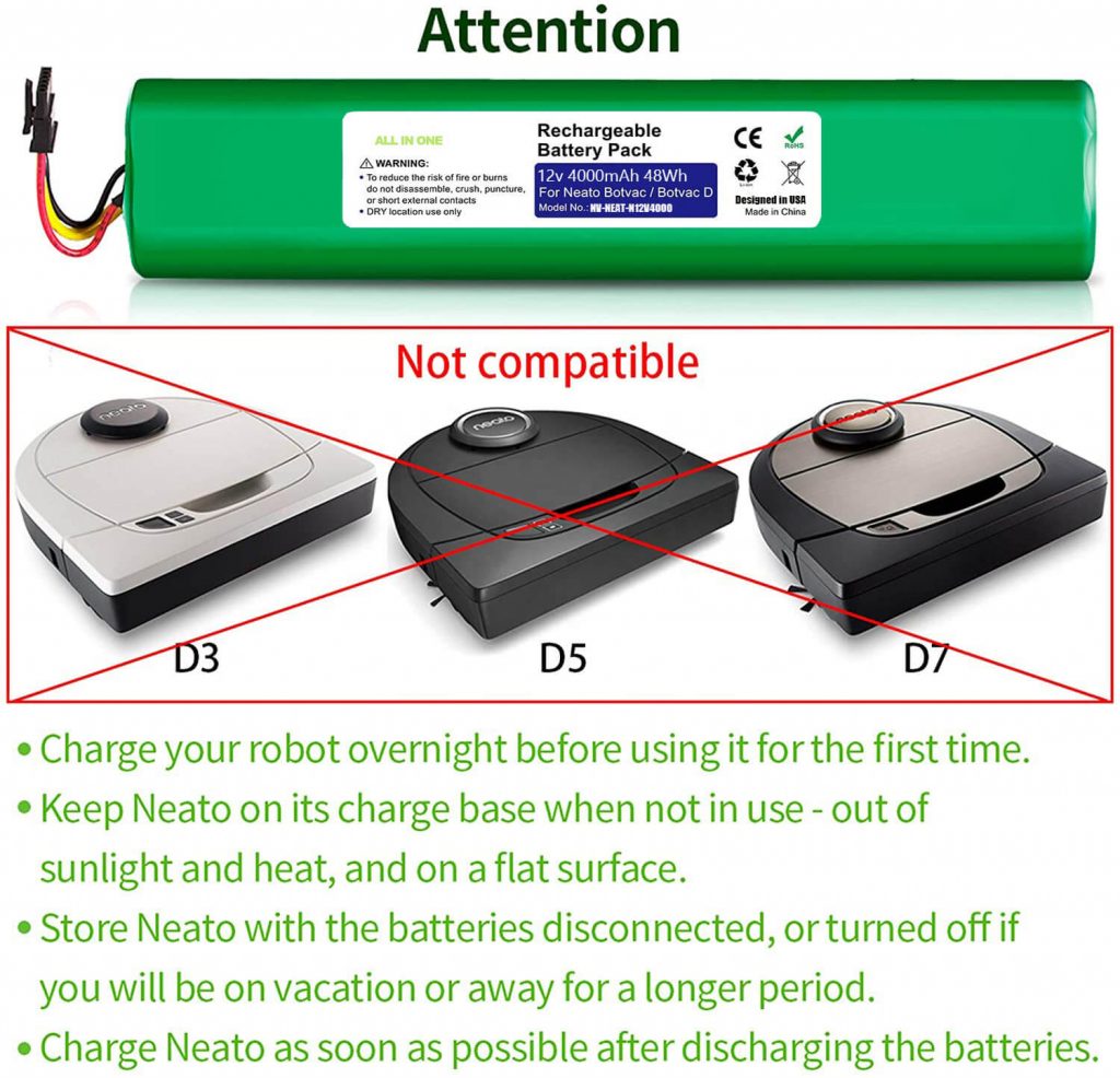 * Koppla bort batteriet eller stäng av maskinen när du förvarar Neato. Vänligen håll cellen under halvladdningsstatyn, varken ladda eller ladda ur den vid långvarig lagring.