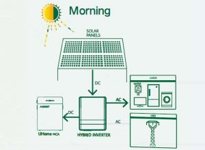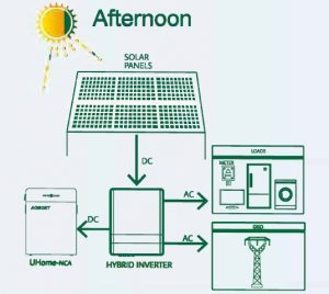 ![]() | Batterier driver AC -belastningen när solen går ner. |