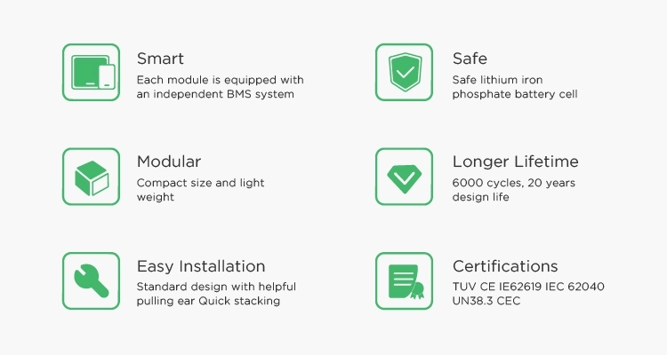 Certifiering & säkerhet Stadard | TUV / CE / EN62619 / IEC62040 / UN38.3 / CEC Ackrediterad | |