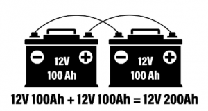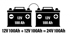 På bilden nedan finns det två 12V batterier ansluten i serie som förvandlar batteribanken till ett 24V-system. Du kan också se att banken fortfarande har en total kapacitetsbetyg på 100 Ah.